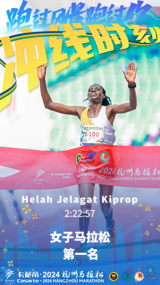 全马女子组,肯尼亚选手Helah Jelagat Kiprop以2小时22分57秒的成绩获得第一名;埃塞俄比亚选手Sadiya Awel Shure以2小时24分57秒的成绩获得第二名,埃塞俄比亚选手Sifan Melaku Demise以2小时27分10秒的成绩获得第三名。特别值得一提的是,本届赛事男子前三选手均打破杭州马拉松赛会纪录,女子第一、第二名选手打破杭州马拉松赛会纪录。