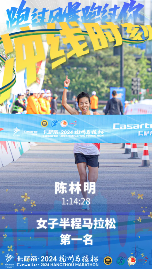 半马女子组,中国选手陈林明以1小时14分28秒的成绩获得第一名;选手郑小倩以1小时15分09秒的成绩获得第二名,选手陆银秀以1小时22分42秒的成绩获得第三名。